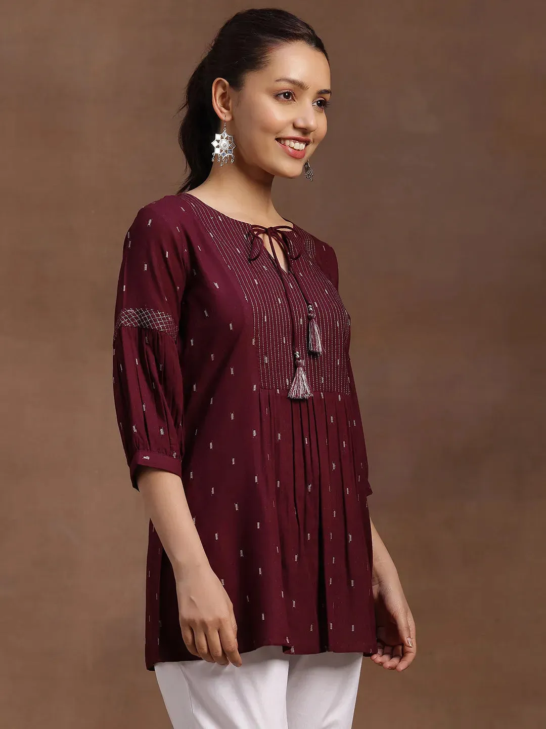 Wine Woven Design Rayon A-Line Kurti
